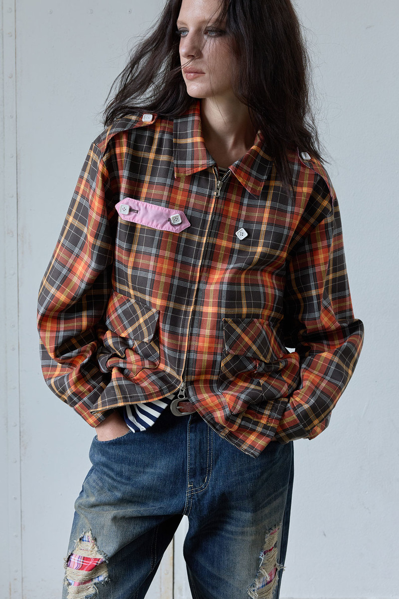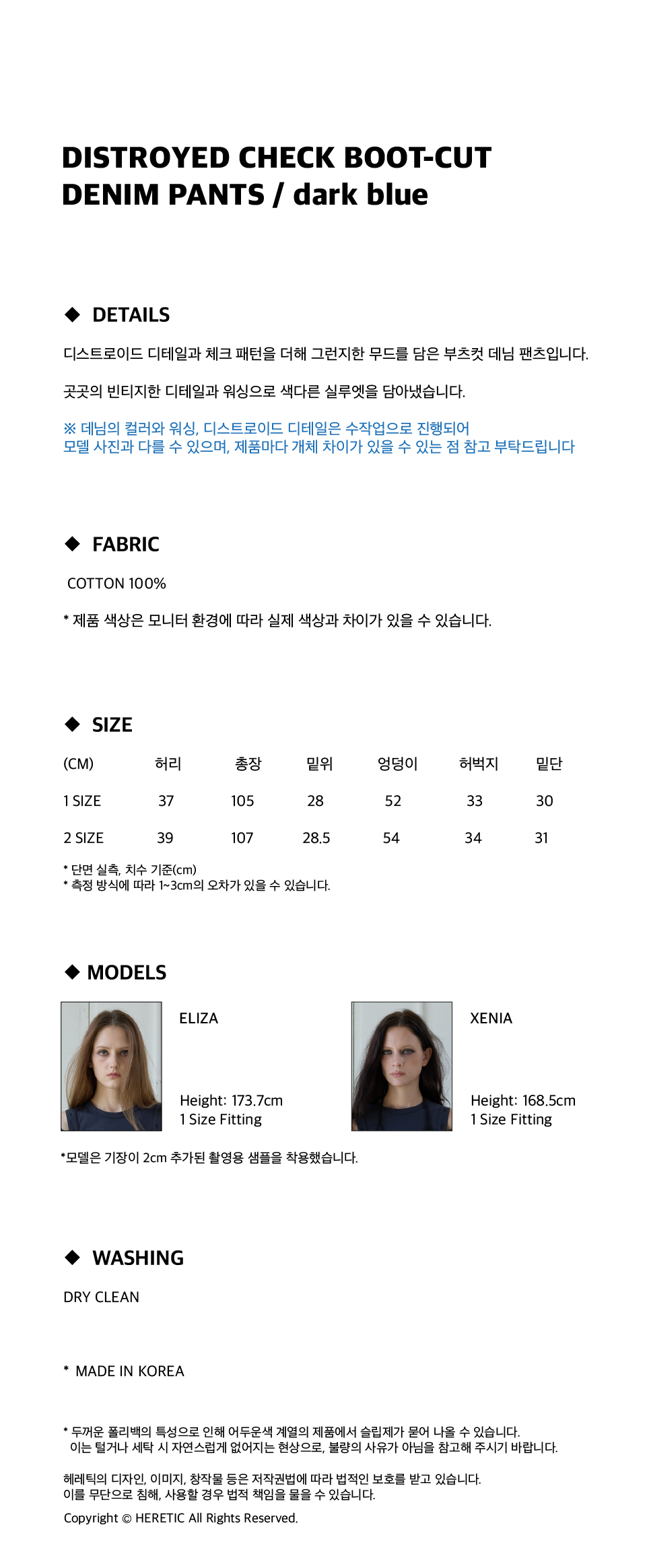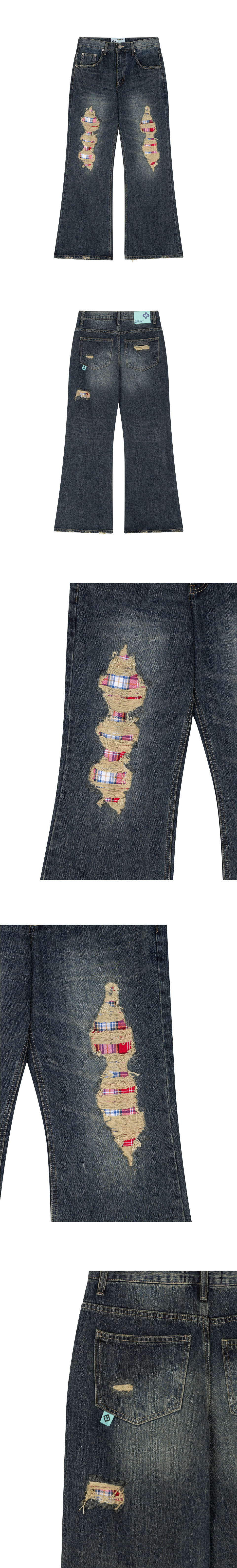 DESTROYED CHECK BOOT-CUT DENIM PANTS / dark blue